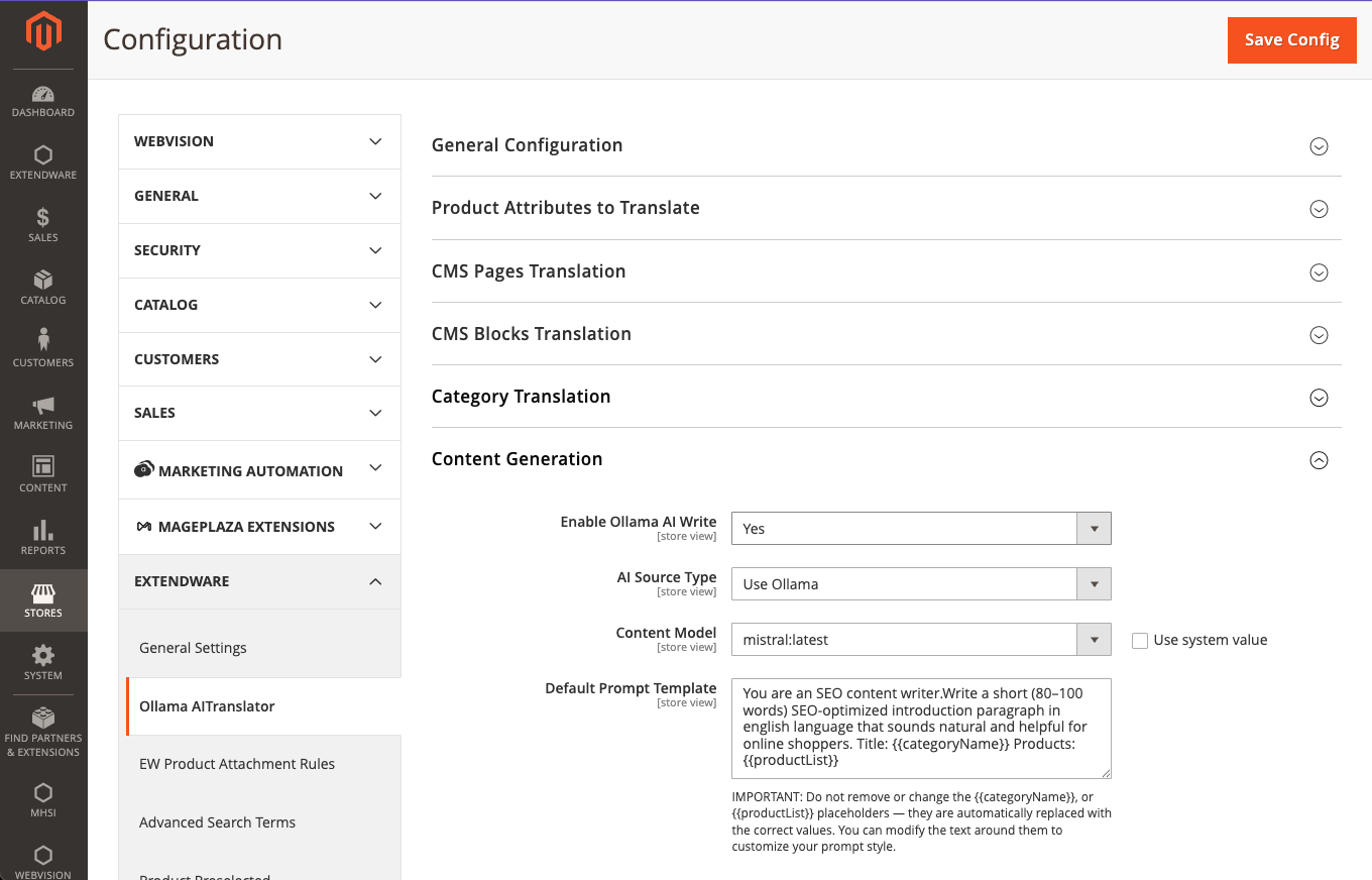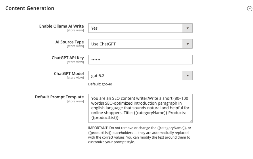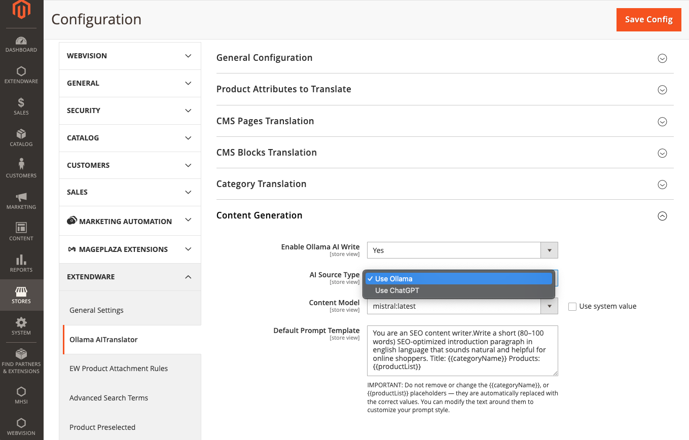 Generieren Sie sofort SEO-optimierte Kategoriebeschreibungen mit ChatGPT oder lokalen Ollama-Modellen direkt in Ihrem Magento-Adminpanel.